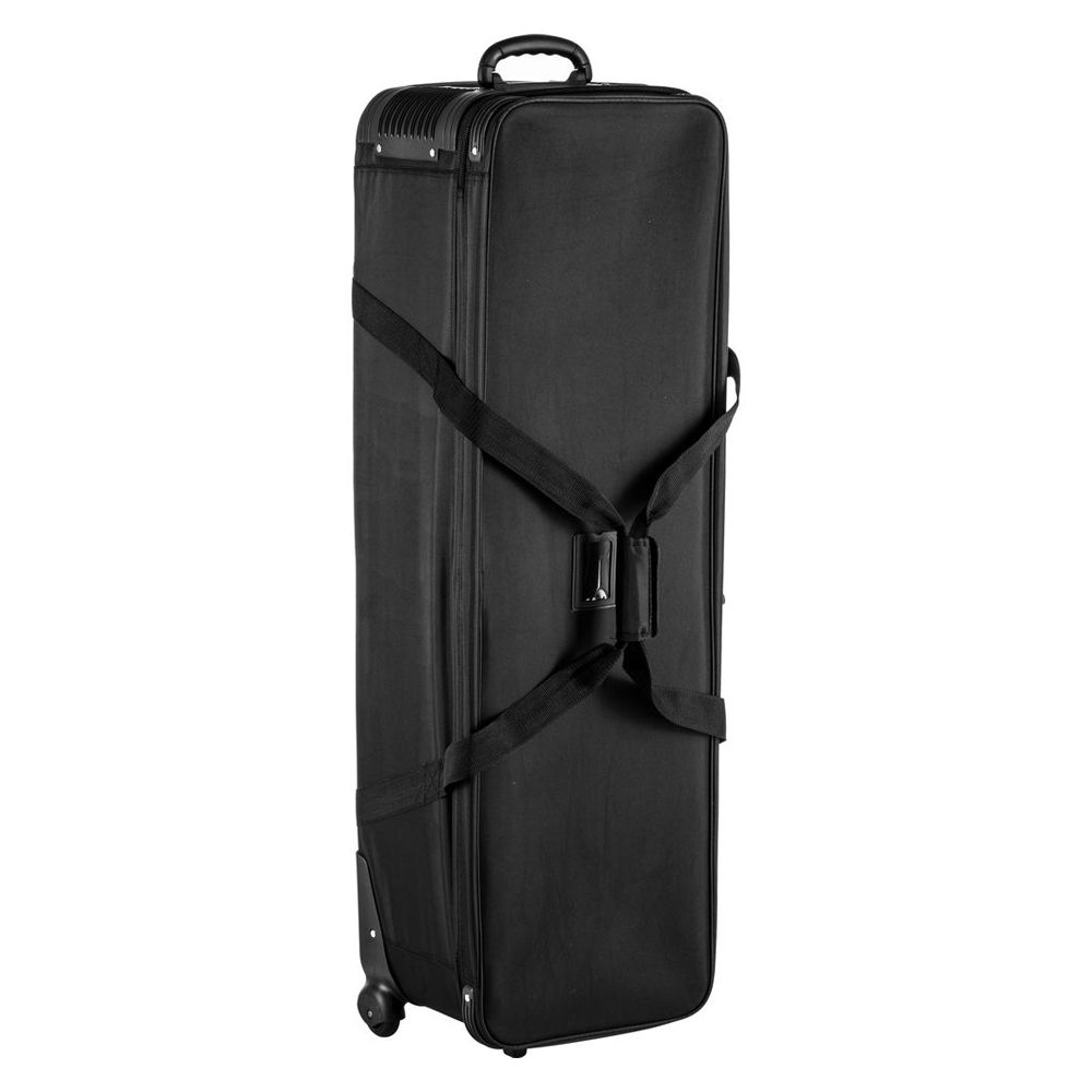 Store, transport, and protect photo gear under 114cm long with the black CB-01 Wheeled Light Stand and Flash Carrying Bag from Godox. The bag features zipper closure, dual, connecting top strap handles, a top haul handle, built-in wheels, and nylon construction. A rubber foot on the bottom of the bag provides upright standing. Corner guards help protect the bag from impact and fabric abrasion.