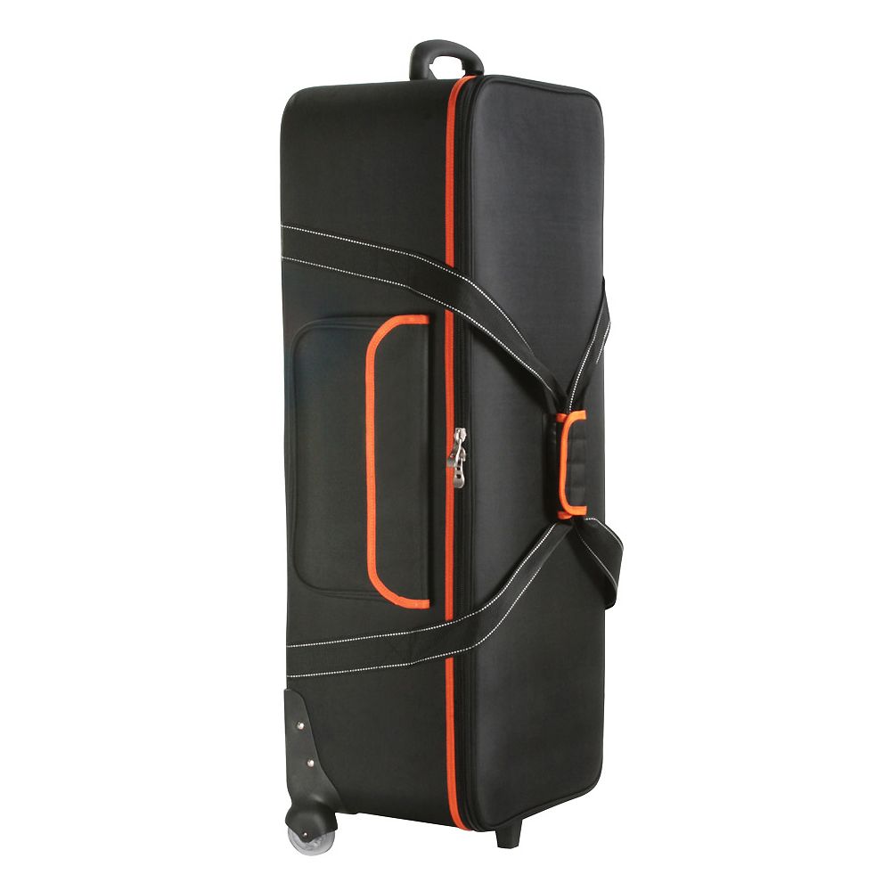 Store, transport, and protect photo gear under 94cm long with the black CB-06 Wheeled Light Stand and Flash Carrying Bag from Godox. The bag features zipper closure, dual, connecting top strap handles, a top haul handle, built-in wheels, and nylon construction. A rubber foot on the bottom of the bag provides upright standing. Corner guards help protect the bag from impact and fabric abrasion.