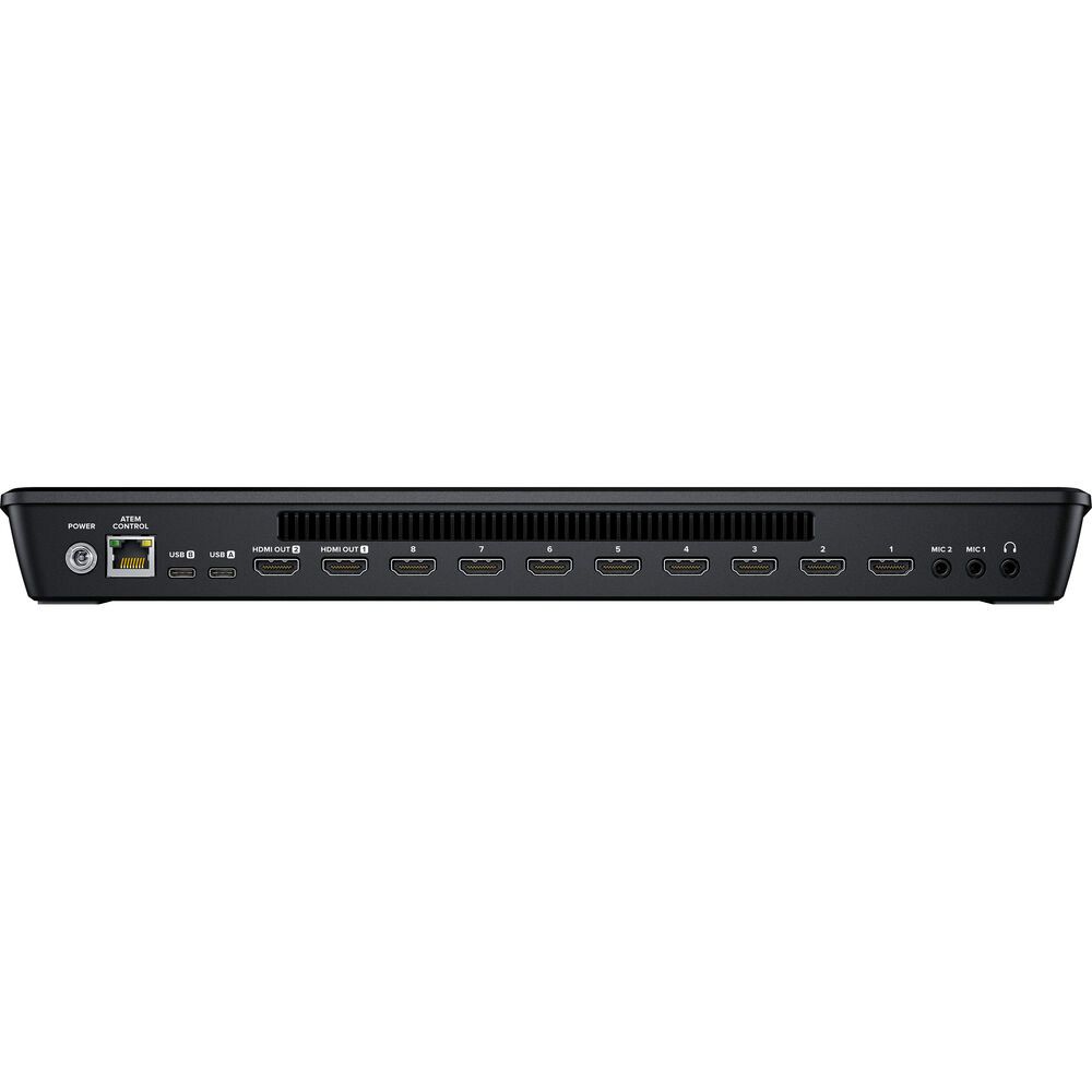 Switch, add effects, color grade, and key in real time using the control surface's buttons, or via the software control panel. CCU functions are available for controlling Blackmagic Studio and URSA Mini/Broadcast/Micro Studio cameras from the switcher. The ATEM Mini Extreme ISO supports up to nine layers, with four upstream and two downstream keyers, up to four chroma keyers, up to four linear keyers, two DVE with borders and drop shadow, five pattern generators, and two color generators. Designed for live streaming or webcam, the Mini Extreme ISO has HDMI outputs to feed monitors and supports up to 16-screen multiview.